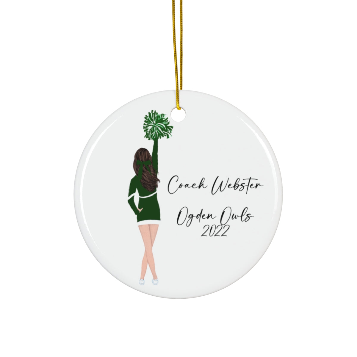 Got a favorite cheerleader or dance team girl? Give her a customized ornament to keep forever. Round white ceramic ornament customized with your choice of color cheerleader uniform. They can be customized with name and date. Perfect memory gift for your dancer or cheerleader. These ceramic ornaments attach securely to the tree to ensure that they’re cat- and child-proof. Customize with hair color and style, uniform colors and text. I will send a proof before final product.